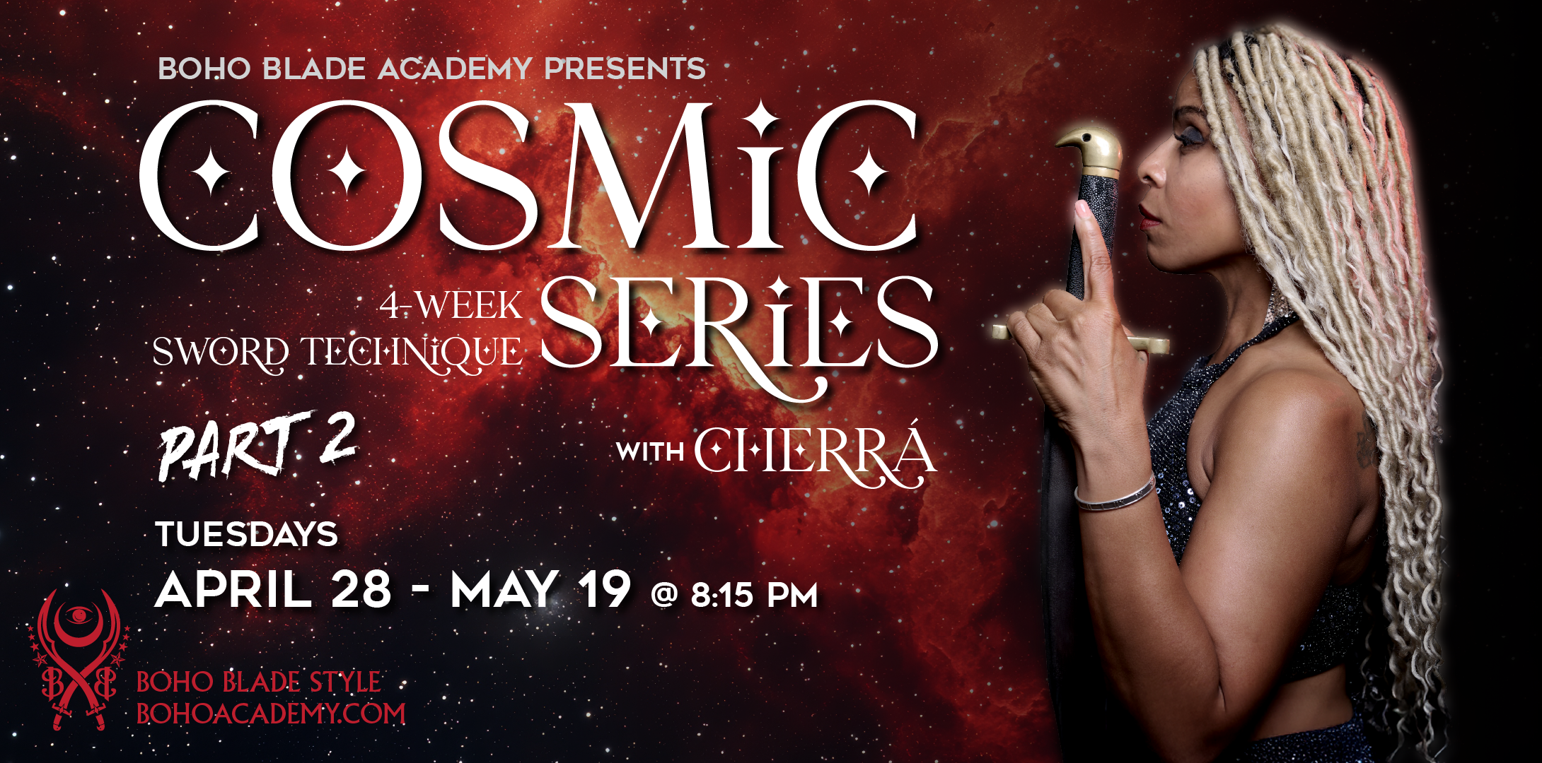 Join Cherra’ from the comfort of your own home and learn how to use the curve of your blade to explore the cosmos, in this beginner-friendly sword experience. Cherra’ Will help you explore how to use your weapon to transform time and space to create a flow with balance rhythm and intention.